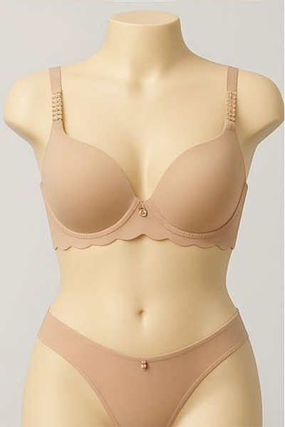The bra features a smooth, streamlined cup design, complemented by a delicate accent—such as small crystal-like beads, thin gold links, or a subtle charm—that adds a touch of quiet sparkle and allure. Experience lightweight support and undeniable charm, all day long.